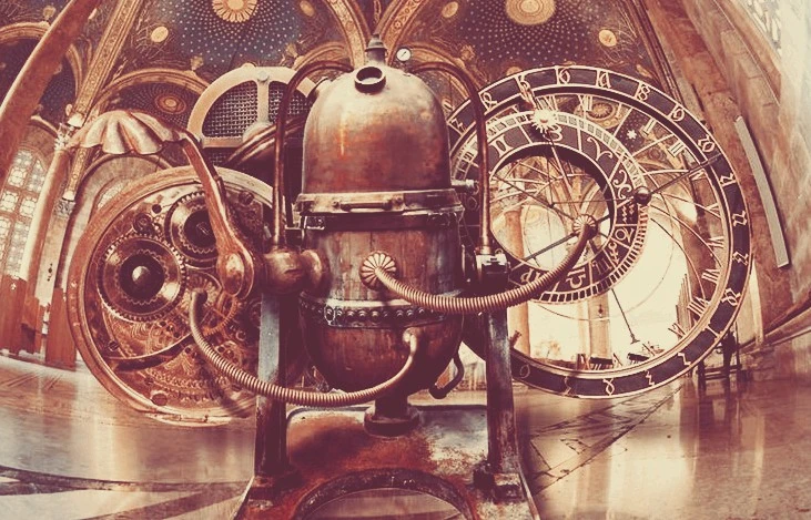 The Realm of Time was designed in the style of a Victorian inventor's mansion and gardens. Following what might today be termed a "steampunk" aesthetic, OmniPark Technosophers used decorative elements like clocks, timelines and calendars to evoke the idea of a wealthy eccentric inventor obsessed with time travel.
