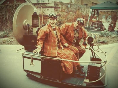 OmniPark ambassadors show off one of the Time Tunnel vehicles at the Realm's official opening in 1977