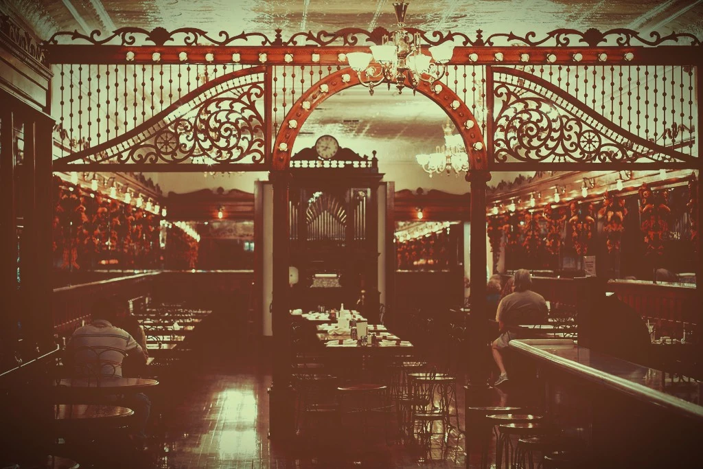 Passing through the mansion's front doors, guests might notice other time-related motifs throughout the oak-paneled entryway. Opposite the restrooms (located to the left of the mansion's foyer) was the Conservatory Parlour, a snack shop where guests could enjoy ice cream, pastries, fountain sodas, and other treats in a tiled room looking out on the mansion's gardens.